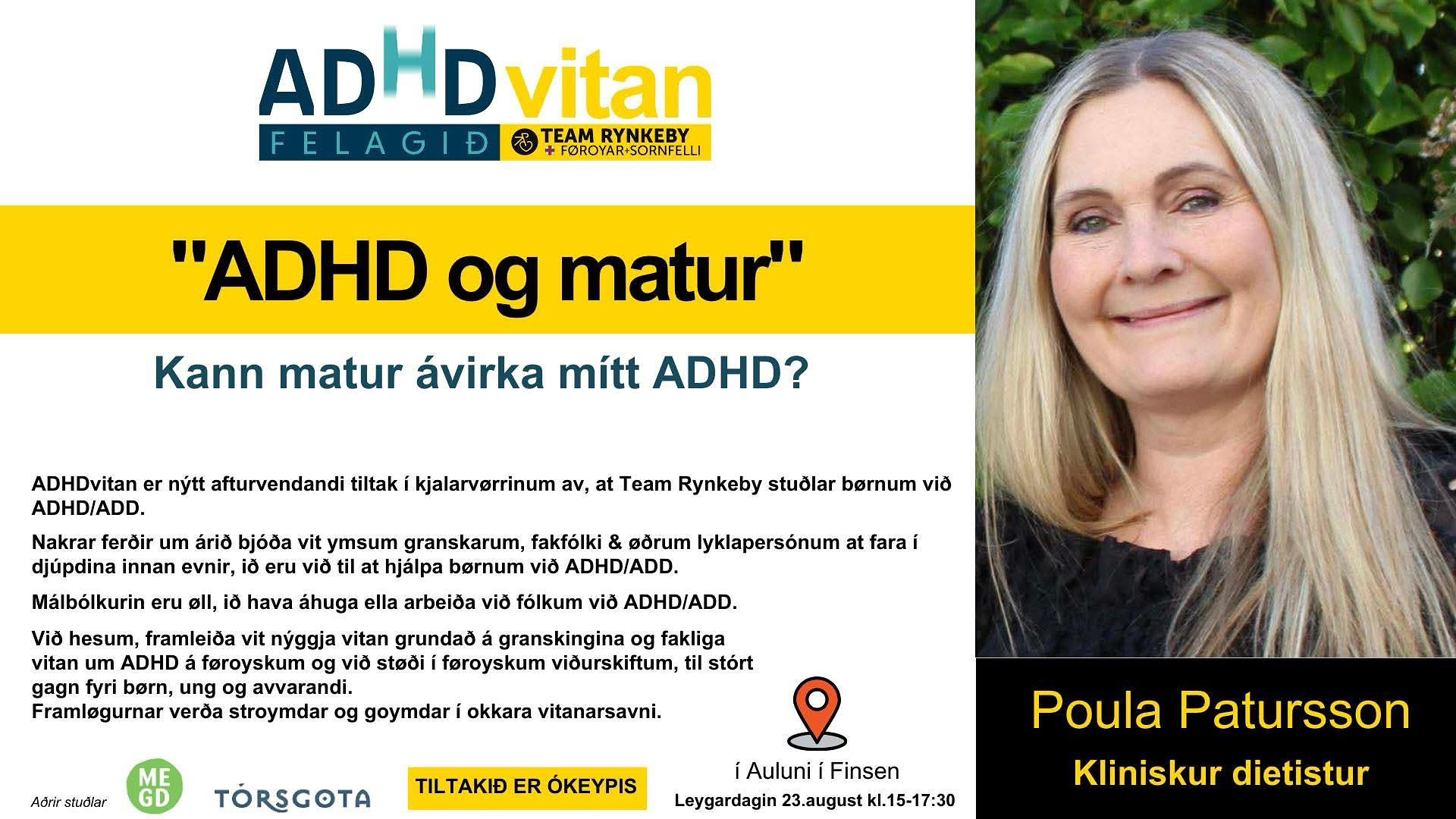 22. august 2025 var eitt ADHD-vitan tiltak í Finsen um kost og ADHD. Poula Patursson, kliniskur dietistur og næstforkvinna í ADHD felagnum hevði framløgu grundað á gransking. Framløgan var upplýsandi, har fokus var á, hvussu matur og liviháttur kunnu ávirka fokus, orku og trivnað hjá bæði børnum og vaksnum við ADHD. Á tiltakinum varð greitt ….  Continue Reading