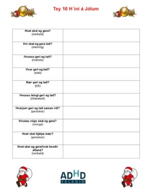 Jólini eru hugnaligt, men kunnu vera stressandi fyri børn við ADHD. Jólahald, jólaklipp, nissuvinir, jólakonsertir, familjutiltøk, jólaveitslur og foreldur, ið skulu náa alt, sum tey skulu. Alt øðrvísi enn tað plagar. Nógv foreldur upplíva, at børnini verða yvirstimulerað í desember mánaða. Bæði av øllum tí, sum er øðrvísi, men eisini av øllum spenninginum og at ….  Continue Reading