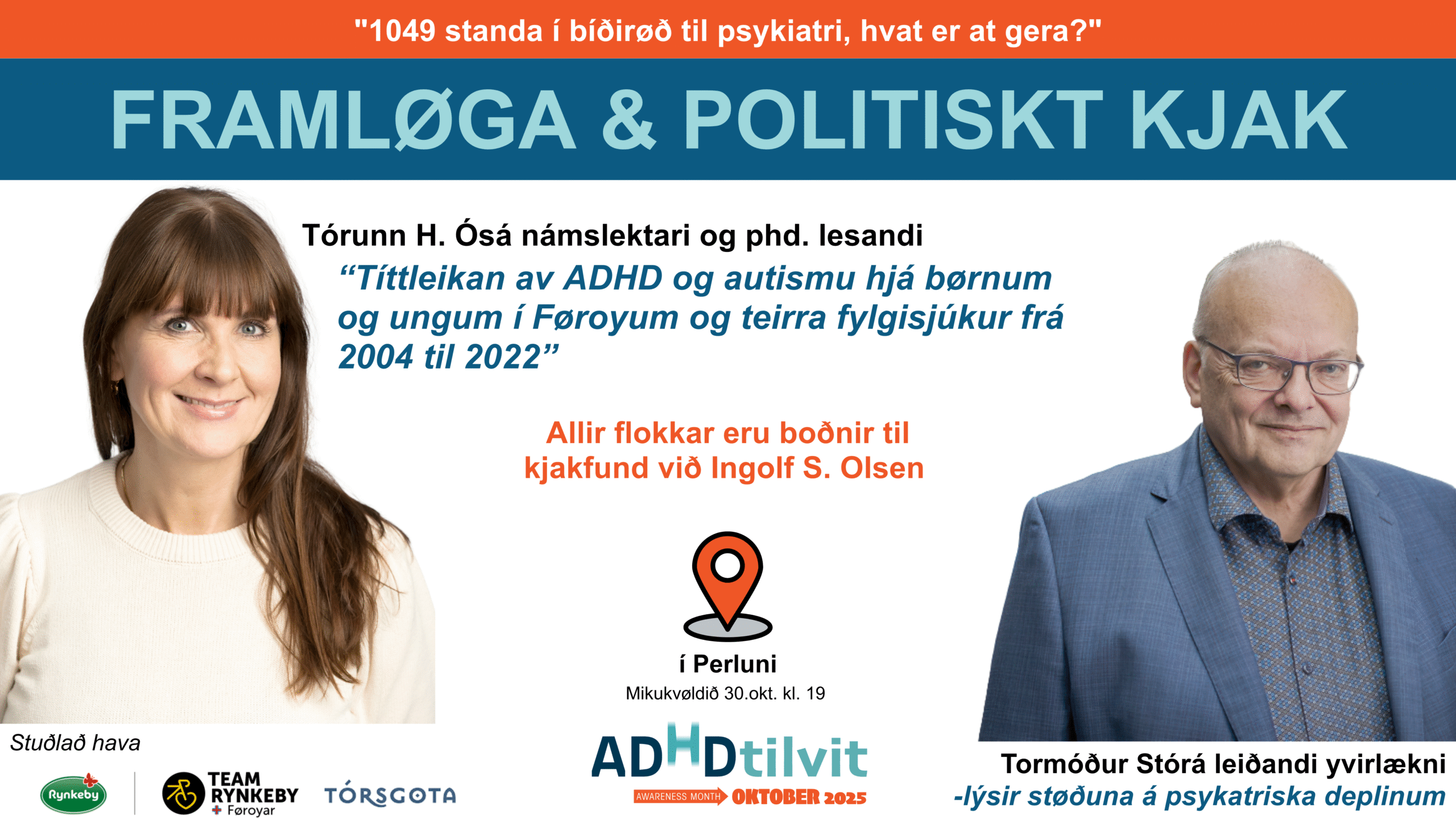 Leygardagin 23. august kl. 15:00–17:30 hava vit ókeypis tiltak í Auluni í Finsen. Kom og lurta, tá Poula Patursson, kliniskur dietistur, fer at halda ein spennandi fyrilestur um sambandið millum ADHD og matin, vit eta. Hvussu ávirkar matur okkara evnir at hugsavna okkum, finna ró og stýra kenslum? Og hvat hevur hetta við ADHD at …. Continue Reading