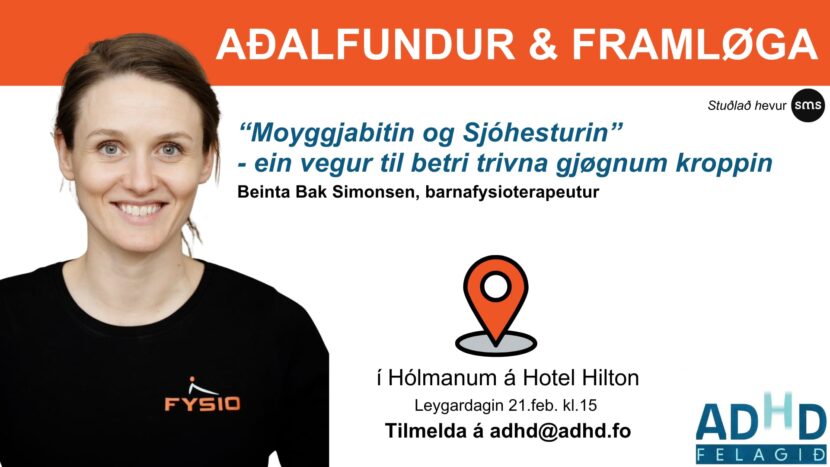 Tilmelding krevst. Ynskir tú, at luttaka á aðalfundinum so er at senda okkum ein teldupost á adhd@adhd.fo. Vit gleða okkum at síggja tykkum.